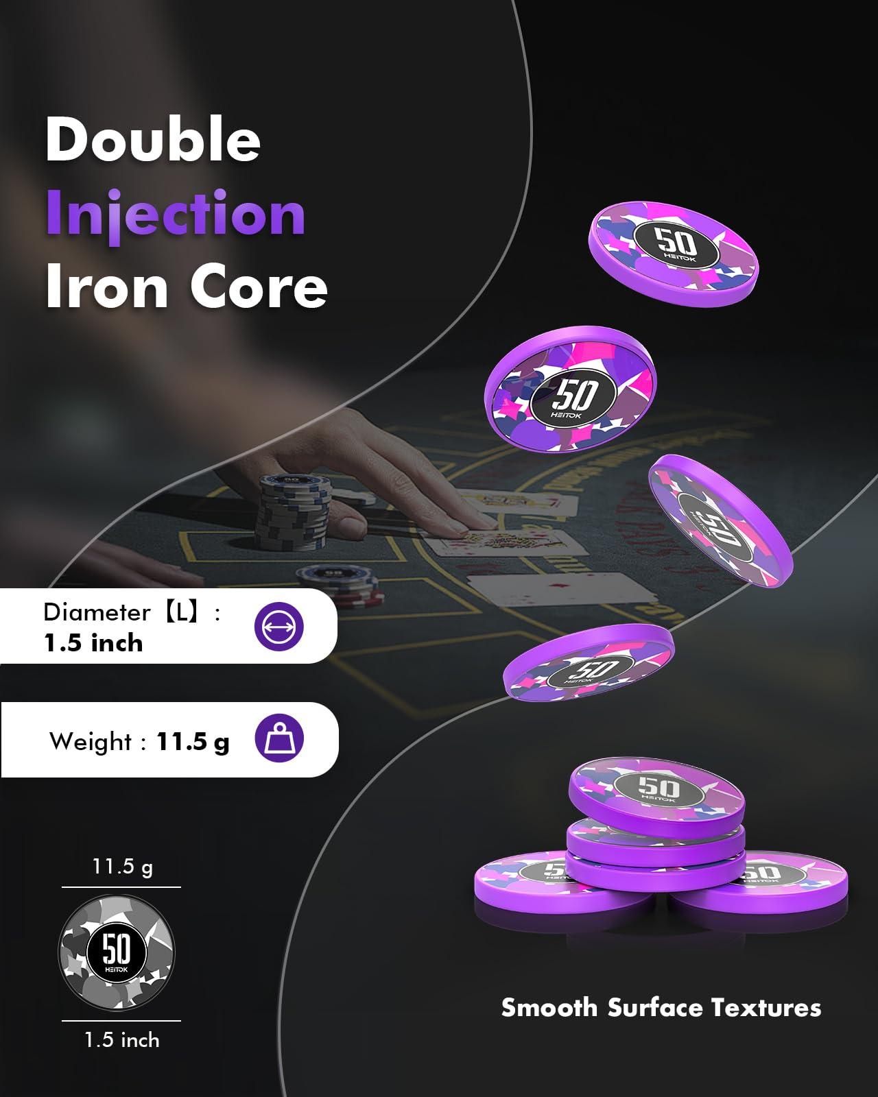 Each chips is 11.5g weighted, 1.5" diameter, 1/8" thick chips. Each piece meticulously weighted to replicate the distinctive feel of casino-grade chips.